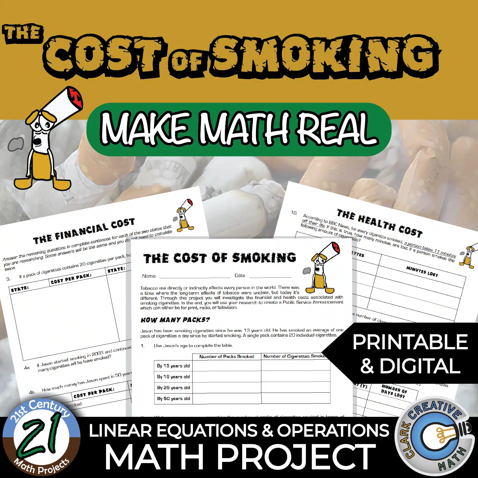 The Cost of Smoking is a health-based math project where students calculate how smoking expenses grow over time, analyze financial tradeoffs, and interpret real-world data about health risks and lifestyle choices.