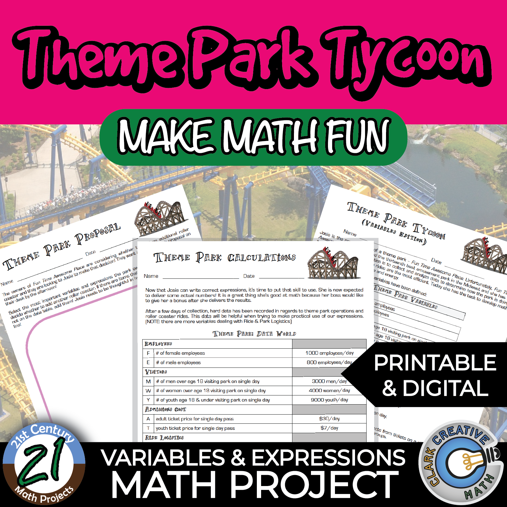 Any teacher knows ANY period can be a roller coaster ride. In this 21st Century Math Project, Variables & Expressions go to the Amusement Park in this engaging four assignment unit designed for Algebra or Pre-Algebra. Bring variables to life using a theme park motif. From park operations to admissions, variables and expressions are the backbone of the analysis of the Amusement Park’s data.