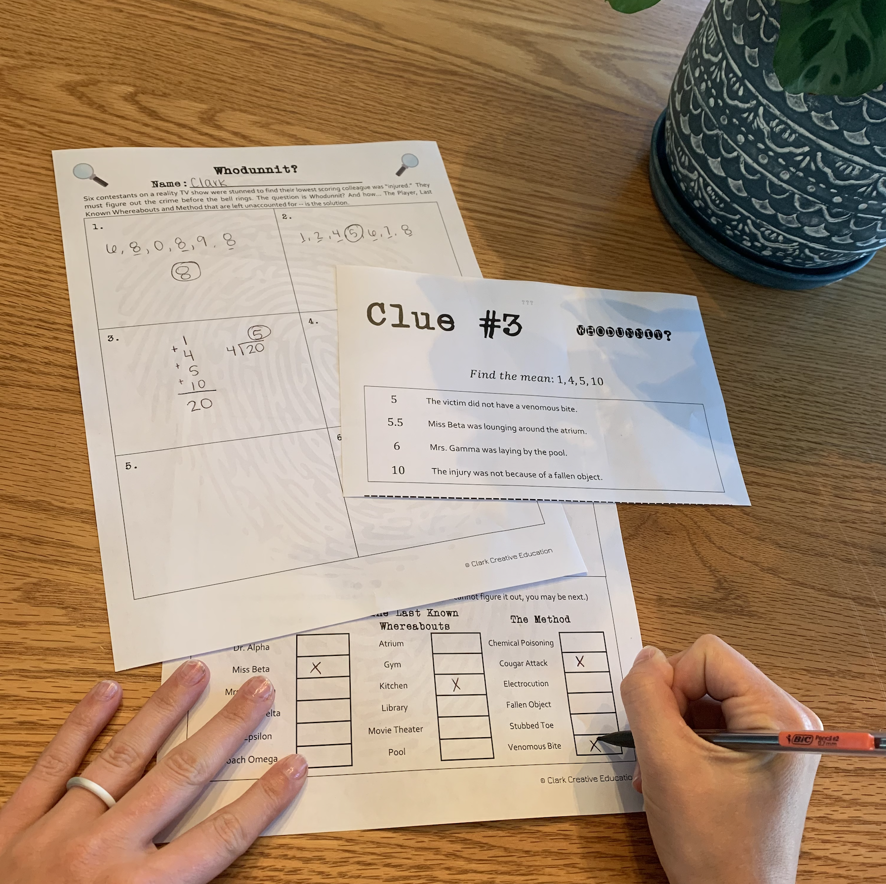 Students solve math problems, then use their answers to eliminate suspects, weapons, or locations. The mystery unfolds only if their math is correct.